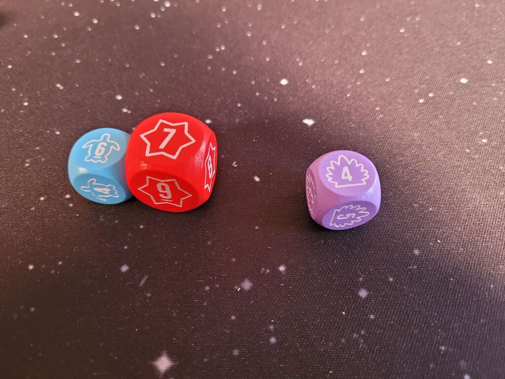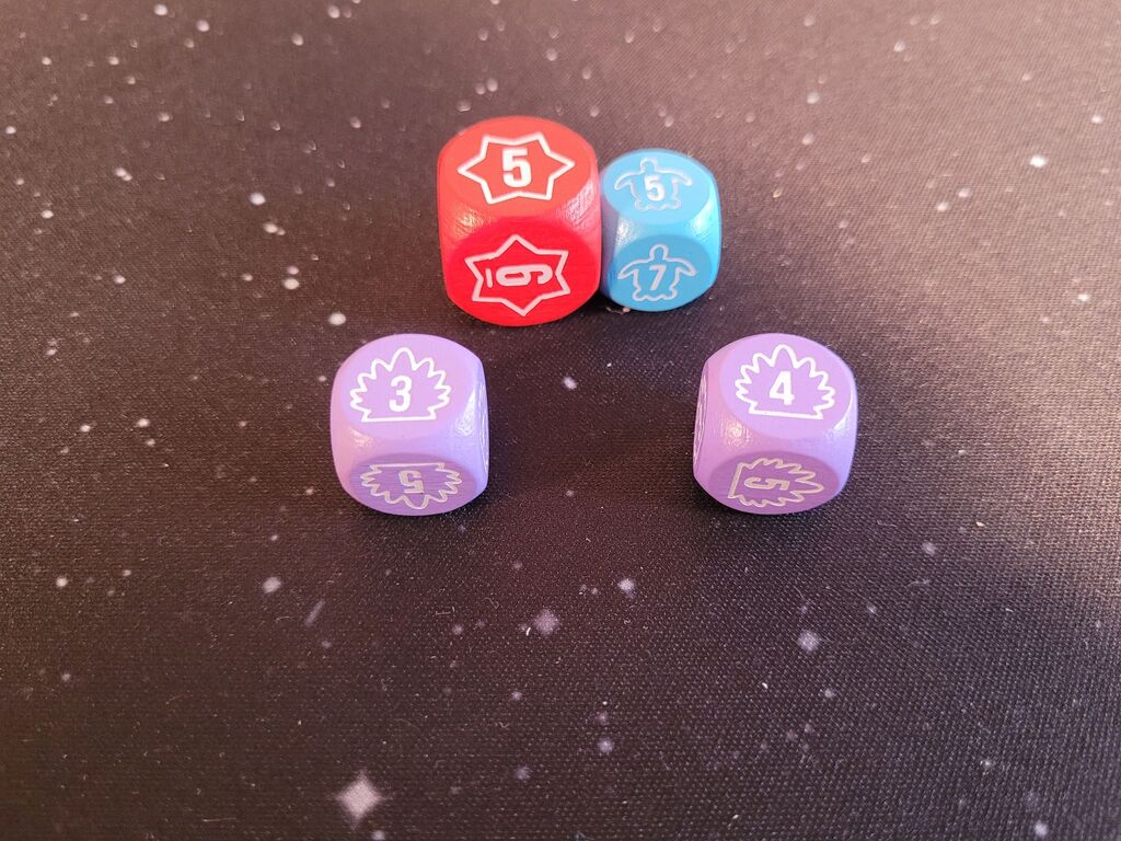 Und dann wär‘ da noch der rote Würfel, mit dem man das Startplättchen erhält und außerdem einen wichtigen Beitrag zum anstehenden Würfelwettkampf. Allerdings bringt er sonst keine Vorteile, also Bewegung oder Korallen oder Fische oder ähnliches.