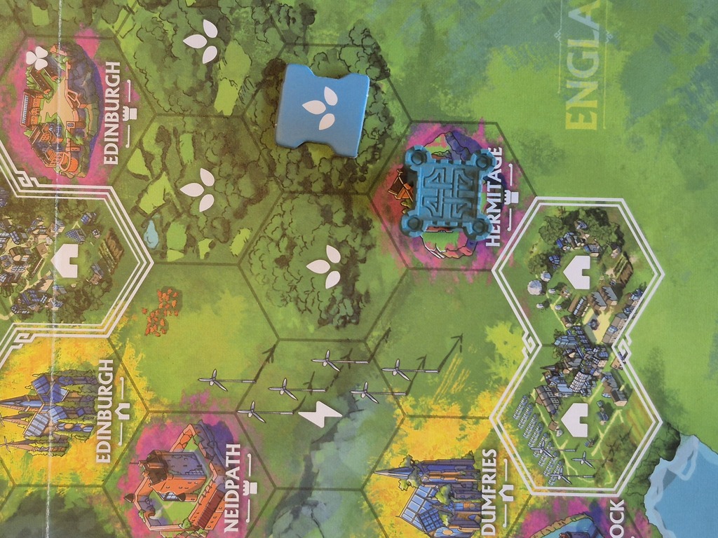 Aber zurück zum ersten Teil und der einfacheren Karte, die Schottland zeigt, unterteilt in Hexfelder mit diversen Symbolen, die festlegen, was die Spieler darauf platzieren dürfen. Und was platzieren wir? Plättchen, Kathedralen und Türme. Das ist aber sehr, sehr verkürzt gesagt.