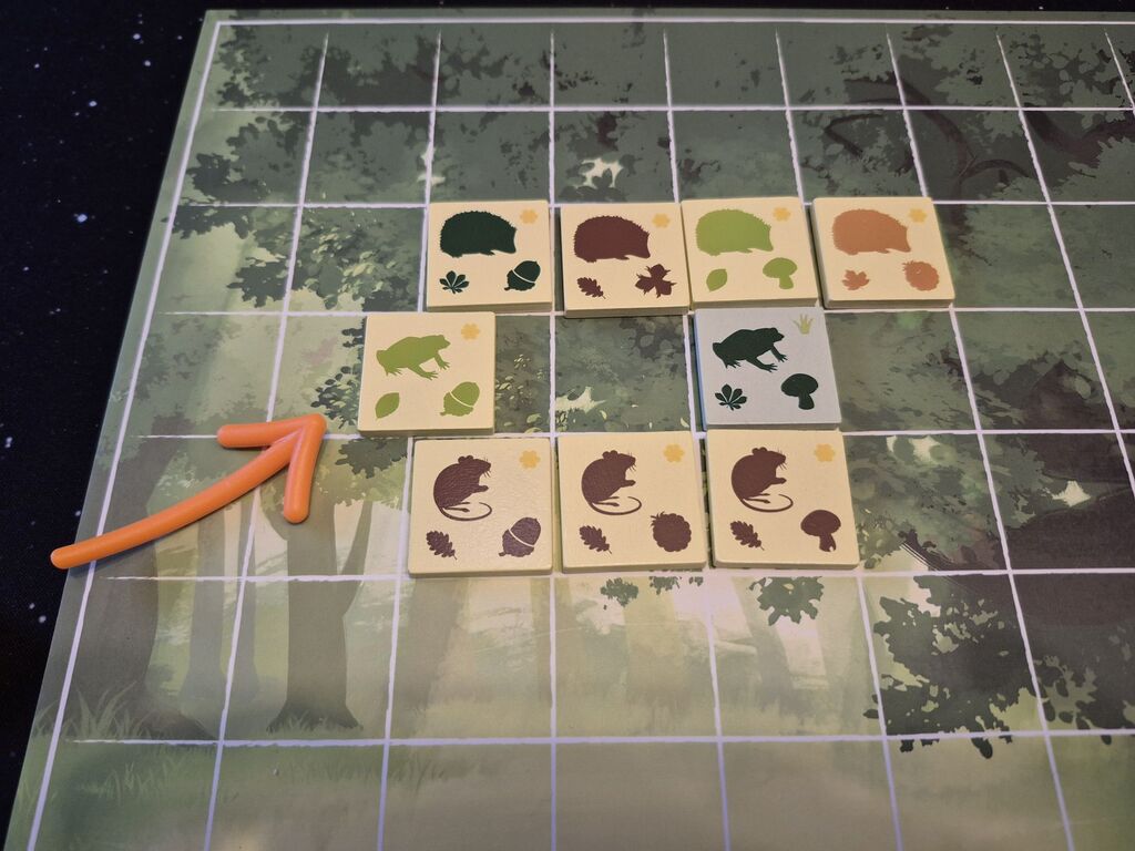 Am liebsten will man dabei Sets aus drei Plättchen bilden, entweder indem man direkt drei von der Hand spielt, oder aber auf der Lichtung durch Anlegen von Plättchen ein neues Set entstehen lässt. Das erste Set wird in die Mitte der Lichtung gelegt. Danach will man eigentlich immer anbauen (muss es aber nicht) – frei liegende Plättchenketten ohne Verbindung zur Mitte bescheren am Ende Minuspunkte. Auch das Maximum – auf einmal ein Set aus vier Plättchen legen – ist ein gern gesehenes, aber seltenes Phänomen.